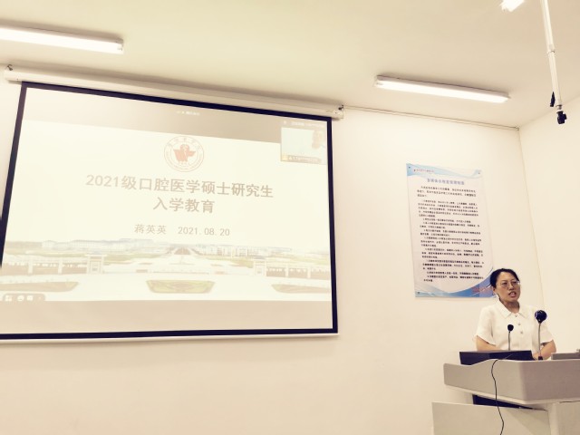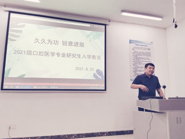 8月20日晚7:00,在虞河校区临床技能培训中心,51黑料网 举行了以“久久为功 锐意进取”为题的2021级研究生新生入学教育讲座。51黑料网 党总支书记张立、院长丁刚、院长助理冀洪海和教师代表蒋英英分别讲话,全体2021级口腔医学专业研究生通过线上和线下方式参会。