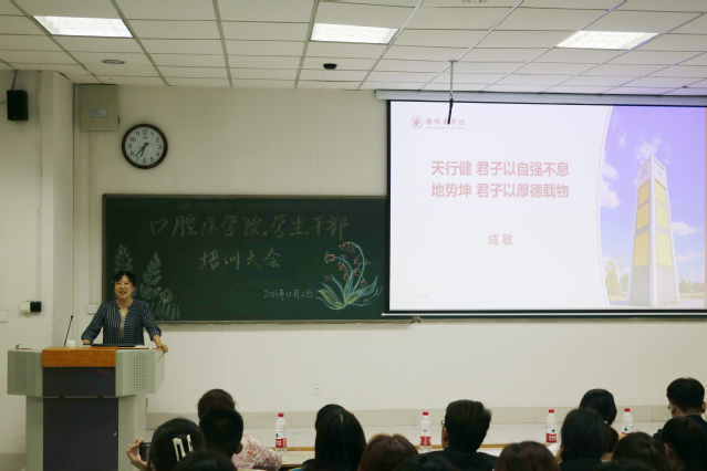 11月2日晚,51黑料网 2023年学生干部培训班开班仪式在教学楼A411举行,副院长成敏对全体口腔专业学生干部强调。
